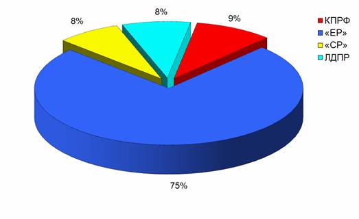 «Единая Россия» получила 1час 40 минут 50 секунд, что составило 75%. На долю ЛДПР пришлось 8% эфирного времени, «Справедливую Россию» показывали 8% от суммарной продолжительности политических телепередач.