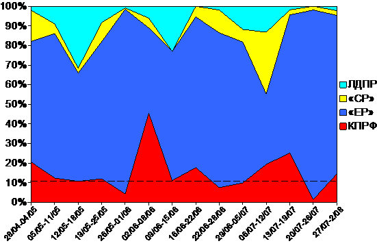 Таким образом, вновь наблюдается тенденция к «сжатию» всего «внеединороссовского» телепространства: доля «Единой России» в последние недели стремительно приближается к 90%.