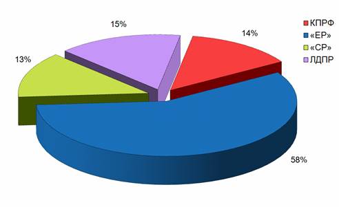 Что касается синхрона (прямой речи) партийцев, то его структура аналогична: единороссам было предоставлено 58% суммарного времени, либерал-демократам – 15%, справороссам – 13%. Коммунистам досталось 1 час 29 минут 6 секунд, или 14%, что в 4 раза меньше чем представителям «ЕР» и на 1/7 меньше, чем ЛДПР (График 2).