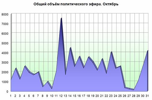 Основные точки политической активности в телеэфире пришлись на 12, 14, 31 и 23 октября. 12 октября это было связано с подведением итогов выборов. 14 октября разразился Думский кризис, когда оппозиционные партии покинули Госдуму в знак протеста против итогов выборов. 23 октября В. Чуров отчитался перед депутатами в Госдуме. 31го октября вышли две крупные телепередачи – на ТВЦ , посвященная расходованию бюджетных средств и на канале «Россия» о том, нужна ли стране смертная казнь.