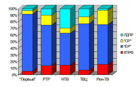 «Единой России» была предоставлена наибольшая доля телеэфира на «Первом» канале (87%). Однако нигде эта величина не опускалась ниже 49%. «Справедливая Россия» заняла максимум эфира телеканала Рен-ТВ (21%). ЛДПР отдал предпочтение НТВ (29%).