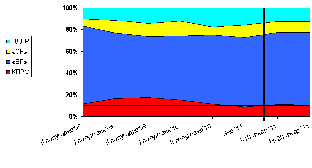 Таким образом, во второй декаде февраля доля КПРФ осталась прежней. Незначительно увеличилась доля ЛДПР (на 1%).