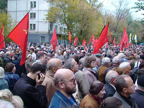 Люди, не задерживаясь на месте запрещенного митинга, со свечами, цветами и плакатами погибших плотными колоннами медленно проследовали через город по Красной Пресне. Шествие шло под звукозапись расстрела Дома Советов. Помимо плакатов погибших люди несли лозунги: «Их убил режим Ельцина», «Нет прощенья палачам!», «Террор в России рожден в октябре 1993 года». А уже на Дружинниковской улице, перед панихидой был организован мини-митинг, который открыл секретарь МГК КПРФ Евгений Доровин, кратко напомнив собравшимся о сути данной годовщины и выразив уверенность в скорейшем восстановлении Советской власти. После него выступил лидер КПРФ Геннадий Зюганов. Он призвал собравшихся поклониться памяти тех, кто грудью встал на защиту Советской власти. Также выразив уверенность в восстановлении СССР и Советской власти, Геннадий Зюганов напомнил, что этот год особенный. Во-первых, это год очередных выборов, а во-вторых – 90-я годовщина Великой Октябрьской Социалистической Революции. Г.Зюганов рассказал, что перед празднованием этой годовщины, в столице братской Белоруссии Минске, а затем и в Москве, соберутся представители более 70 коммунистических партий со всего мира для выработки положений нового социализма XXI века. Последняя фраза вызвала стихийный шквал аплодисментов. На этом краткий митинг пришлось свернуть – не было более никаких заявлений, не удалось провозгласить резолюцию – на запрещенных митингах не бывает резолюций. Но подготовленный инициаторами акции проект резолюции есть и мы его, содержащего принципиальную оценку случившегося и целый ряд требований к власти нынешней, публикуем ниже.