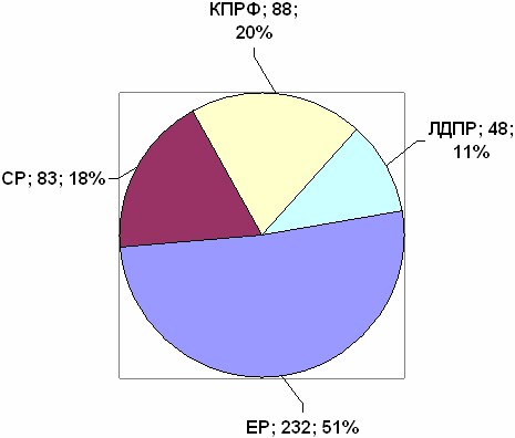 Таким образом, если семипроцентный барьер в декабре 2007 года преодолевают только 4 партии («ЕР», КПРФ. «СР» и ЛДПР), то в Думе пятого созыва сложится более неустойчивая для «ЕР» ситуация. Хотя союз «ЕР», «СР» и ЛДПР способен гарантировать Кремлю «железобетонное» конституционное большинство. Вместе с тем неустойчивое абсолютное большинство «ЕР» открывает возможность для различных группировок «партии власти» с целью добиться больших возможностей для лоббирования собственных интересов.