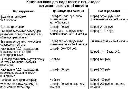 Какие санкции для водителей и пешеходов вступают в силу с 11 августа можно посмотреть на таблице.