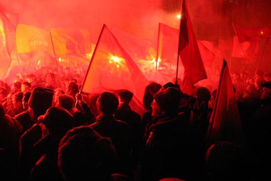 Митинг, посвященный 90-летию Октябрьской революции, завершился у крейсера "Аврора" под звуки "Интернационала", который исполнили собравшиеся, передает корреспондент "Фонтанки". Манифестанты призвали вернуть государственный праздник в честь революции 7 ноября. Это предложение стало одним из пунктов резолюции, которая была зачитана перед собравшимися.