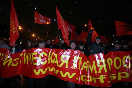 Питерский Интернет-сайт.fontanka.ru разместил фоторепортаж о митинге КПРФ у крейсера "Аврора" в честь 90-й годовщины Великой октябрьской социалистической революции.