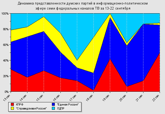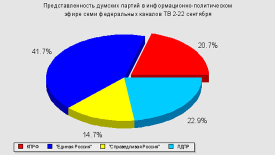 Сводные данные мониторинга ТВ за 2-22 сентября свидетельствуют, что абсолютное доминирование «ЕР» несколько ослабло (41,7% времени информационно-партийного эфира).