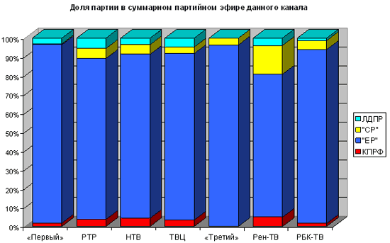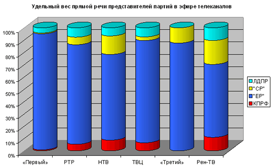 Монопольное положение «ЕР» в телеэфире особенно очевидно на «Первом» и «Третьем» каналах. Здесь прямая речь представителей этой партии заняла, соответственно, 94 и 88 процентов от суммарного синхрона представителей всех партий. Доля КПРФ в суммарной продолжительности прямой речи политиков на ТВ оказалась максимальна в пятую предвыборную неделю на телеканале Рен-ТВ и НТВ (11 и 9%), а «Третий» канал в течение всей недели не предоставил слово коммунистам.