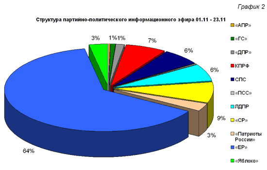 Из них 29% было отведено СПС, 21% - «Единой России», по 12% - «Справедливой России» и «Патриотам России», 11% - ЛДПР, 8% - «Яблоку», 4% - «Гражданской силе» и 3% - Аграрной партии. Распределение можно было бы назвать близким к равномерному, если бы не тотальный игнор всеми телеканалами Компартии Российской Федерации, деятельность которой не была отражена во всём пятничном информационном телеэфире.