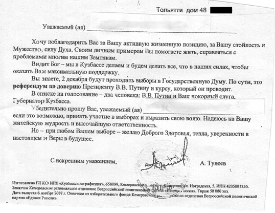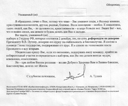 На территории Кемеровской области распространяются агитационные печатные материалы в виде именного обращения к избирателям за подписью А.Тулеева с дополнительно отпечатанными машинописным способом именем, отчеством и адресом избирателя, в которых содержатся признаки откровенной дезинформации граждан. В частности, содержится следующее предложение: «В списке на голосование – два человека: В.В. Путин и Ваш покорный слуга, Губернатор Кузбасса» или «…в списке на голосование после Президента я иду вторым». Тем самым избиратели сознательно вводятся в заблуждение относительно состава списка кандидатов в депутаты Государственной Думы, выдвинутых партией «Единая Россия» (реально на верхних местах в списке – миллиардер О.И.Аршба, небезызвестная Л.Слиска, к Кузбассу не имеющая никакого отношения; видимо, они и будут представлять этот регион в Госдуме). Распространение подобных материалов является злоупотреблением свободой массовой информации, то есть нарушением части 1.1. статьи 56 Федерального закона от 12.06.2002 г. № 67-ФЗ «Об основных гарантиях избирательных прав и права на участие в референдуме граждан Российской Федерации».