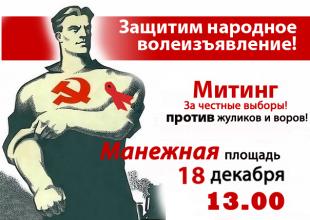КПРФ в воскресенье, 18 декабря, проведет в центре Москвы 15-тысячный митинг протеста против фальсификации парламентских выборов, сообщил "Интерфаксу" зампред ЦК КПРФ, депутат Госдумы Владимир Кашин.