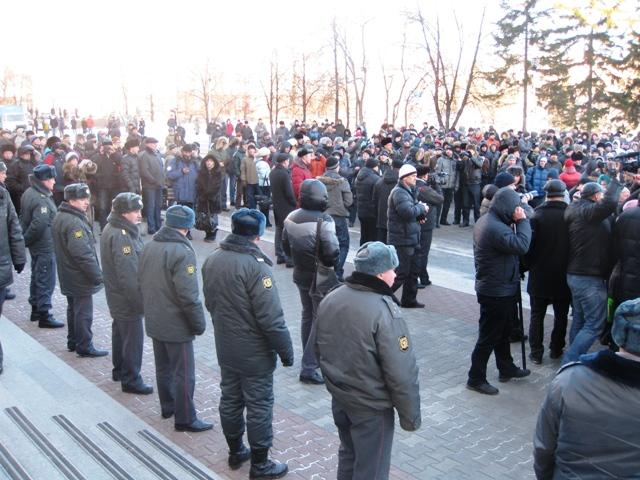 Собравшиеся разогревались все больше и выкрикивали лозунги: «Долой Чурова!», «Долой Путина!», «Перевыборы!», «За отмену выборов!». После 13.00 часть митингующих, достав плакаты перешла к крыльцу здания краевой администрации, за ними последовали остальные. У дверей администрации участники митинга начали громко скандировать различные лозунги: «Долой Путина!», «Путин - вор!», «Позор Единой России!», "Перевыборы!" и другие. Некоторое время спустя собравшиеся попытались сжечь портрет Путина, однако, по каким-то причинам передумали. Вскоре в толпе появился молодой человек несущий красное знамя, как выяснилось — не коммунист, но как он пояснил: «Я просто несу знамя своих отцов и дедов!».