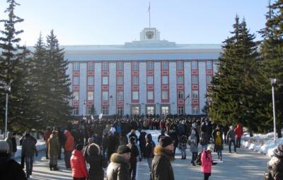 Собравшиеся разогревались все больше и выкрикивали лозунги: «Долой Чурова!», «Долой Путина!», «Перевыборы!», «За отмену выборов!». После 13.00 часть митингующих, достав плакаты перешла к крыльцу здания краевой администрации, за ними последовали остальные. У дверей администрации участники митинга начали громко скандировать различные лозунги: «Долой Путина!», «Путин - вор!», «Позор Единой России!», "Перевыборы!" и другие. Некоторое время спустя собравшиеся попытались сжечь портрет Путина, однако, по каким-то причинам передумали. Вскоре в толпе появился молодой человек несущий красное знамя, как выяснилось — не коммунист, но как он пояснил: «Я просто несу знамя своих отцов и дедов!».