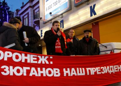 В руках собравшихся – красные флаги СССР и КПРФ, лозунги, осуждающие произвол власти и «Единой России» на выборах и требующие призвать правящий режим к ответу: «ЕдРо – в помойное ведро!», «ЕдРо – не решение, «ЕдРо» - проблема!», «За сменяемость власти!», «За честные выборы!». Часть плакатов была посвящена предстоящим президентским выборам: «Даёшь честные теледебаты!», «Слабо дать Зюганову 4 часа телеэфира?», «Воронеж: Зюганов – наш президент!»