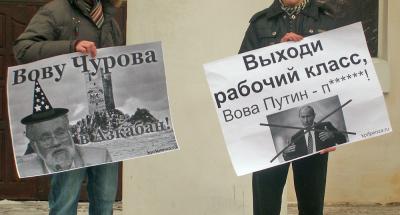 Активисты ЛКСМ держали в руках плакаты «Выходи рабочий класс!»; «Вову Чурова - в Азкабан!» и другие. Остальные раздавали свежий выпуск информбюллетеня «От Советского Информбюро».