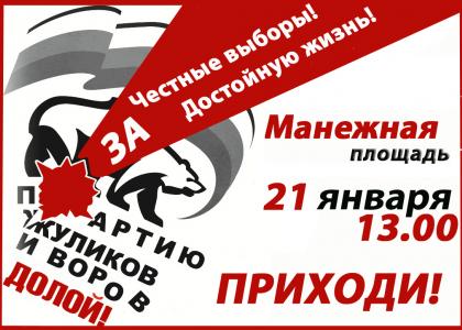 Заявленное рядом гражданских активистов намерение провести очередную акцию «За честные выборы» лишь в начале февраля, на наш взгляд, является недопустимой политической паузой в организации массового общественного давления на партию власти с целью принуждения ее к соблюдению основных прав и свобод граждан, конституционных гарантий. Поэтому КПРФ по поручению более чем 30 общественных движений, профсоюзов, молодежных, женских, ветеранских и творческих организаций подала заявку в мэрию г. Москвы на проведение 21 января в 13 часов на Манежной площади митинга объединенной оппозиции в рамках кампании «За честные выборы».