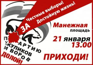 За честные выборы и достойную жизнь! "Россия без Путина!"В субботу, 21 января 2012 года в 13.00 начнется митинг объединенной оппозиции «За честные выборы и достойную жизнь».В акции примут участие руководители КПРФ, депутаты Государственной Думы, региональных парламентов, коммунисты Московского городского и Московского областного отделений, представители общественных организаций.Приглашены представители трех парламентских партий и более 40 общественных организаций и структур гражданских активистов.