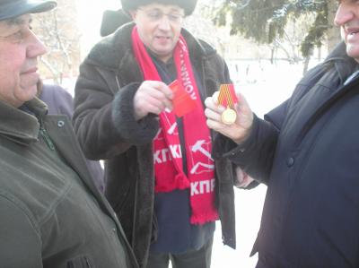 Первый секретарь Кемеровского областного комитета КПРФ Сергей Аленичев и Председатель Контрольно-ревизионной комиссии Владимир Ханкиладиев приняли участие в пикете в г. Юрга, на котором Сергей Андреевич вручил юбилейную медаль ветерану партии, подполковнику милиции Улихину Владимиру Михайловичу в связи с днем рождения.