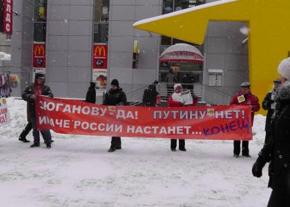 Примерно в час дня на проспекте Кирова от Детского мира до Вольской в «живую цепочку» выстроились две сотни протестующих граждан. Либерал-демократы, эсеры, коммунисты, националисты, общественники и представители несистемной оппозиции продемонстрировали настоящее единение. Практически каждый участник акции стоял с плакатом. «Россия без Путина», «Не верь! Не бойся! Голосуй!», «Фальсификаторов итогов голосования — под суд», «Путин — это печально» — это лишь малая часть надписей, красовавшихся на плакатах митингующих. Расположившись напротив ресторана «Макдоналдс» и растянув большой красно-белый баннер, представители КПРФ одновременно скандировали: «Зюганову — да! Путину — нет! Иначе России настанет… конец!».