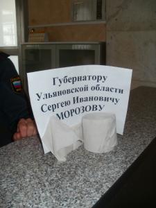 27 марта в приемные Президента РФ Медведева, премьер-министра, «беспартийного лидера правящей партии» Путина и губернатору Морозову эти подарки доставлены. Упаковка с сорока рулонами туалетной бумаги и резолюция митинга без каких-либо проблем были оставлены в приемной Президента, которая находится в офисе Главного федерального инспектора по Ульяновской области г-на Козина.