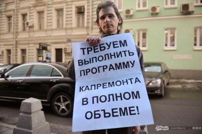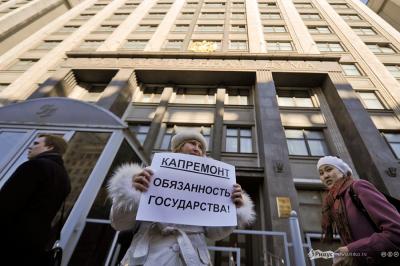 Как передает корреспондент РИА Новости, около 10 человек пикетировали здание Госдумы, требуя от государства выполнения своих обязательств по осуществлению капремонта жилых домов.