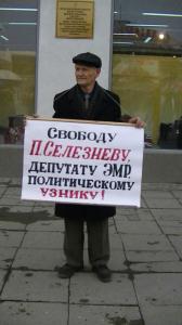 Люди стояли с плакатами на расстоянии 30-40 метров друг от друга. На одном из плакатов было написано: «Свободу П. Селезневу депутату ЭМР, политическому узнику». Павла Селезнева - энгельсского депутата-коммуниста - по решению суда под надуманным основаниям, заключили под стражу на четверо суток.