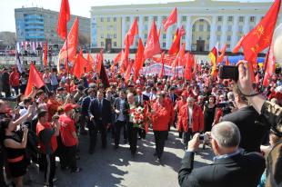 С площади 30-летия Победы митингующие направились на центральную площадь Ленина, чтобы возложить цветы к памятнику основателю советского государства. Пришлось прорывать полицейскую цепь, поскольку полиция хотела направить митингующих в обход через подземный туннель. Но коммунисты пошли напрямую, продемонстрировав силовикам свою мощь и решимость.