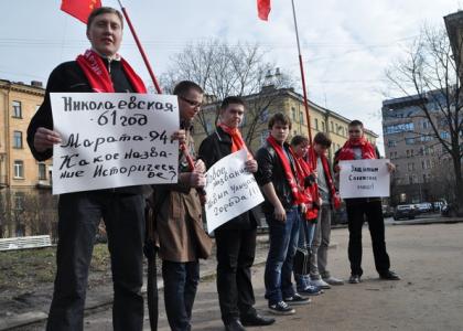 Под таким лозунгом прошел 27 апреля 2012 года пикет против инициативы Топонимической комиссии Санкт-Петербурга о переименовании ряда улиц города, организованный Санкт-Петербургским городским отделением Ленинского комсомола РФ.