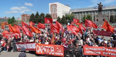 1 мая в 10.30 в г.Саратове на площади возле цирка по призыву областного комитета КПРФ собрались участники первомайской акции протеста из центральных районов города. Сюда же вскоре подошли многочисленные колонны из Октябрьского и Волжского районов г.Саратова. После формирования общегородской колонны участники праздничного шествия, возглавляемые группой комсомольцев и знаменосцами с огромным красным знаменем длиной 26 метров, расцвеченные сплошным кумачом знамён, флагов и транспарантов КПРФ, с красными нагрудными бантами, в сопровождении автомашины, транслирующей патриотические песни, прошли под первомайские речевки и лозунги по центральным улицам города до пл. Революции, где и состоялся общегородской митинг протеста. Впереди колонны шел рабочий с тележкой, в которой вез булыжники – оружие пролетариата.
