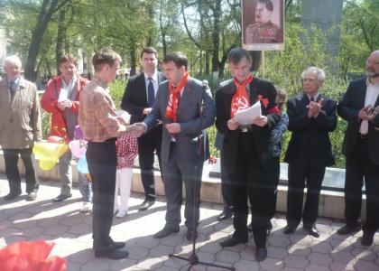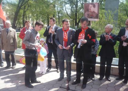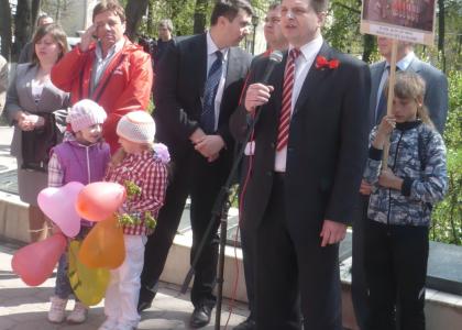 К микрофону подходит первый секретарь обкома, депутат Госдумы Юрий Афонин. Он напомнил, что большинству собравшихся пришлось пройти через сложную избирательную кампанию 2011-2012 годов. От имени лидера партии Геннадия Зюганова он поздравил участников митинга с Днём международной солидарности трудящихся. В своём выступлении он также напомнил, как ведут себя «шмаковские» профсоюзы, забывшие, что такое интересы человека труда. Руководитель тульских коммунистов вручил три партийных и один комсомольский билет вступающим в ряды коммунистического движения. Причём, трое вновь принятых в КПРФ – щёкинцы, из которых двое – муж и жена и ещё одна женщина, у которой муж уже коммунист.