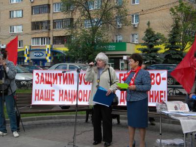 Председатель Фрязинского городского отделения ВЖС «Надежда России» Клара Новикова и депутат Мособлдумы Наталья Еремейцева. Выступает фрязинец, кандидат технических наук Александр Чернятин, один из самых активных защитников Усадьбы Гребнево.