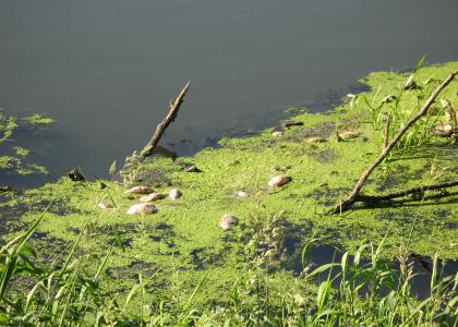 Плавучий остров вновь вырос на том же месте. Он состоит из жижи, из мусора по краям, листьев, какой-то травы и корней.