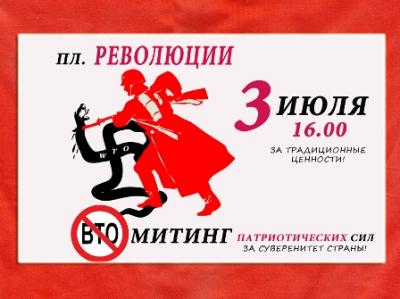 Во вторник, 3 июля 2012 года состоится митинг против ратификации Соглашения о вступлении России во Всемирную Торговую Организацию (ВТО), за суверенитет страны, за традиционные ценности, против ювенальной юстиции.