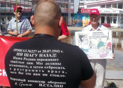 Очень современно выглядит размещенная на футболке участника пикета цитата из знаменитого приказа № 227 «Ни шагу назад!», который подписал в суровые годы Великой Отечественной войны И.В. Сталин.