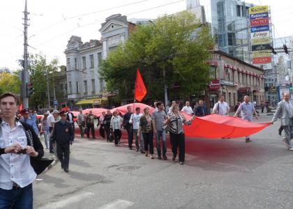 «Марш миллионов» в Саратове прошел по улицам города в буквальном смысле под красным флагом. Огромное красное полотнище несли десятки людей, сотни шли в колонне следом за ним и еще, наверное, столько же шло по тротуарам вокруг проезжей части.
