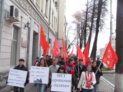 Девятнадцать лет назад был расстрелян избранный народом Верховный Совет. Каждый год те, кто помнит трагические события октября 1993 года, собираются в центре Екатеринбурга у памятника Ленину и идут шествием к Вечному огню, чтобы почтить память погибших защитников Верховного Совета и советской власти.