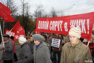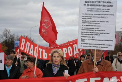 В заключение митинга была принята резолюция. Затем по проспекту Мира состоялась демонстрация. Её участники шли с транспарантами: «Повергнем систему зла! Вернем социализм!», «Кощей бессмертен, пока иванушки дурачки!», «Только жулик и урод может грабить свой народ!», «Цены вверх за газ и воду, время встать с колен народу!», «Путина план – залезть к нам в карман!», «Долой спрут в ЖКХ!», «дЖЭКов-потрошителей к народному суду!», «Только смена власти разорвет удавку ЖКХ!», «Заплати за свет, тепло, воду и сдохни!», «Президент! Не можешь выполнять предвыборные обещания – уходи!», «Современная логика: Дедушка ЛЕНИН - 53 года! А молодой ПУТИН - 60 лет!», «Защита в суде прав обманутых дольщиков – обязанность исполкома!», «Издевательскую субсидию отдаю Шайхразиеву и Халикову!», «Мэр, прекрати издевательство субсидиями!», «Путин встречает 60-летие со зловещими рекордами! Сегодня Россия занимает передовые места в мире: