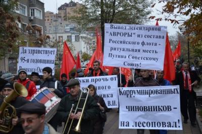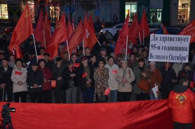 95-ю годовщину Великого Октября даже погода в донской столице, в Ростове-на-Дону, решила отметить солнечным, не по-осеннему теплым днем. В отличие от администрации города, которая ссылаясь на письмо Минтранса области о том, что традиционная демонстрация по пешеходной улице Пушкинской создаст препятствия для движения транспорта по единственному пересекаемому проспекту Ворошиловскому, предложила изменить заявленный маршрут, сократив его практически в два раза.