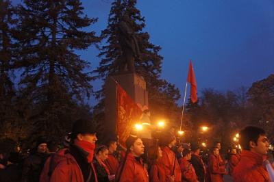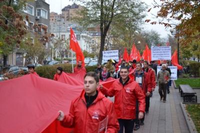 Спустя полчаса колонна, возглавляемая членом Президиума ЦК КПРФ, первым секретарем Ростовского ОК КПРФ Н.В. Коломейцевым и первым секретарем Ростовского-на-Дону горкома КПРФ Е.И. Бессоновым под звуки музыки двинулась к месту проведения торжественного митинга. Особенностью демонстрации этого года стал развернутый комсомольцами впереди колонны 30-метровый флаг Советского Союза.