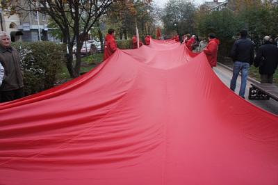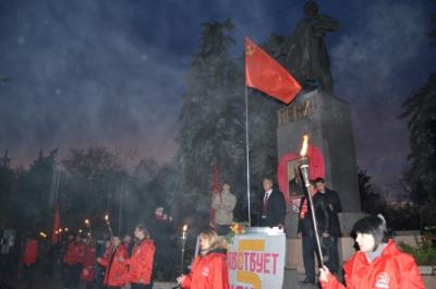 В пять часов вечера площадка возле памятника А.С. Пушкину заалела кумачом советских флагов и флагов КПРФ. Духовой оркестр, играющий знакомые всем марши, напоминал спешащим с работы ростовчанам и застрявшим в пробке водителям об очередной годовщине Великого Октября.