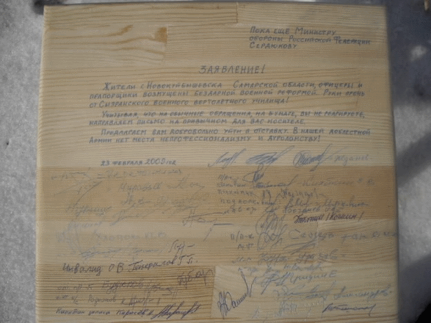 Данное Заявление было принято в ходе протестных акций 22 - 23 февраля 2009 г. в городах Тольятти, Новокуйбышевск и Сызрань, говорится в сообщении пресс-службы. Активисты КПРФ, сторонники партии, представители Союза Советских офицеров, ветеранских организаций протестовали против закрытия Сызранского вертолетного училища. Причиной выбора табурета в качестве информационного носителя стало то, что он хорошо знаком Сердюкову, который большую часть трудовой деятельности посвятил именно мебельной отрасли (с 1985 по 2000 г.г). Как сказал Секретарь Самарского обкома КПРФ, депутат Самарской Губернской Думы Алексей Владимирович Лескин, «данное мероприятие - это часть областной акции протеста против закрытия Сызранского вертолетного училища и бездарной политики министра обороны РФ Сердюкова. Учитывая, что на обычные обращения на бумаге Сердюков не реагирует, коммунисты направляют письмо на привычном для него носителе – табуретке. Мы предлагаем Министру обороны РФ добровольно уйти в отставку и не позорить доблестную Российскую Армию»
