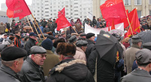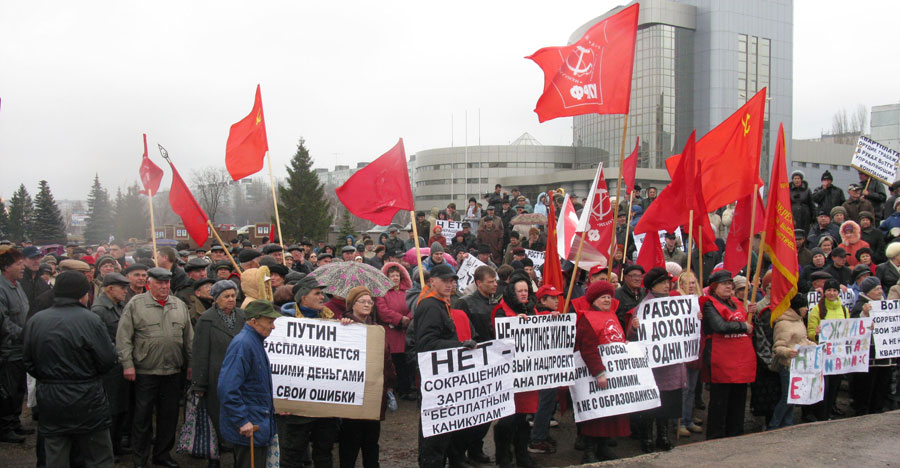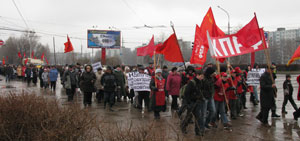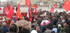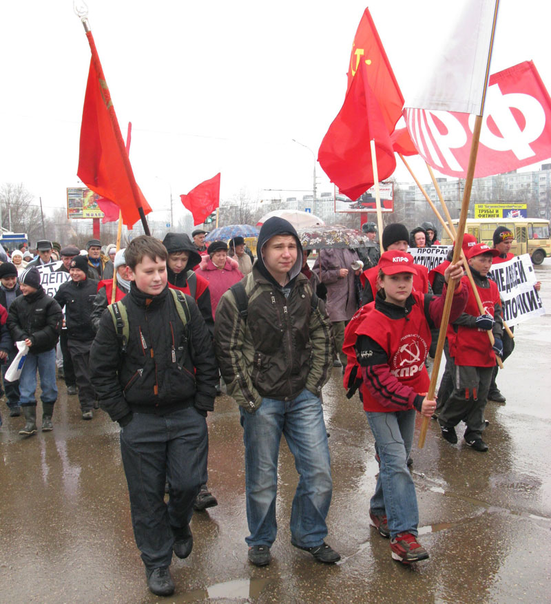Но начало мероприятия внушило представителям власти некоторый оптимизм. На точке сбора за пять минут до начала акции собралось не более пятидесяти человек. Причиной тому послужила еще и отвратительная погода. Около-нулевая температура, ветер, и дождь с мокрым снегом. Однако стоило заиграть призывной музыке, как к формирующейся колонне начали подтягиваться люди, которые до того стеснительно стояли в сторонке. И к моменту выхода колонна насчитывала уже более сотни человек. Несмотря на все уговоры милиции Марш вышел на проезжую часть и двинулся к центральной площади. Под музыкальную композицию, в которой на фоне «Вставай страна огромная» и «Время — вперед» диктор рассказывал об ужасающих цифрах кризиса, как в стране, так и в городе, и призывал народ к борьбе, к маршу присоединялись все новые и новые участники. Кто-то ждал шествия, кто-то оказавшись случайным его свидетелем, поспешил поддержать марширующих. Надо отметить, что коммунисты впервые проводили шествие в этой части города, поэтому для этих горожан оно было новым явлением. Люди выходили на балконы, целыми семьями выглядывали в окна, опустели магазины вдоль маршрута движения. Люди читали плакаты с требованиями «ВоТГК, корректируйте свои зарплаты, а не наши квартплаты», «лилиПУТИНЫМ — наши лилипутские зарплаты», «Нет сокращению рабочих мест и насильным каникулам», «ЕГЭ — дебилизация страны», «Рост цен и тарифов — цацпроект «Единой России», «Кудрина, Фурсенко, Сердюкова, ПУТИНА — в отставку» и т.д. Какие-то плакаты были выполнены профессионально, какие-то написаны на скорую руку. Наибольший же интерес и даже шок вызвали озвученные через громкоговоритель цифры путинского геноцида за последние годы, особенно ситуация с детьми и молодежью. Поэтому песня «Путин, за все ответь!» была подхвачена многими идущими, а кто-то громко выкрикнул - «Ответит никуда не денется! лишь бы не сбежал как Ельцин». К центральной площади подошло уже около четырехсот человек. На площади марш встречали те, кто решил принять участие лишь в митинге. И через пятнадцать минут. несмотря на погоду под окнами городской администрации собралось уже более семисот человек. В процессе выступления лидера балаковских коммунистов Александра Анидалова, озвучившего программу КПРФ по выходу из кризиса и рассказавшего о деятельности властей на местном уровне, выступления председателя «Союза «Чернобыль» Павла Шестакова, не оставившего камня на камне от Путинско-Медведевского плана выхода из кризиса и других участников мероприятия народ неоднократно высказывал свое согласие с выступающими приветственными криками. По решению собравшихся, Анидалов и Шестаков направились в здание администрации, чтобы еще раз (помимо письменного приглашения) пригласить кого-либо из четырех глав для встречи с людьми. Внутри здания было неспокойно — усиленная охрана, множество милиционеров в разных чинах и ... пустые кабинеты трех глав. Лишь в четвертом шло совещание — все о народе совещались, наверное, господа (так и подумалось «Не берегут себя»). Но к этому народу так никто и не рискнул показаться. Одно обнадеживало — слышимость была прекрасная и мнение народа здесь узнали. Отсюда же с высоты четвертого этажа было видно как на противоположенной стороне площади между магазинами начали выстраиваться «чернорубашечники» местн