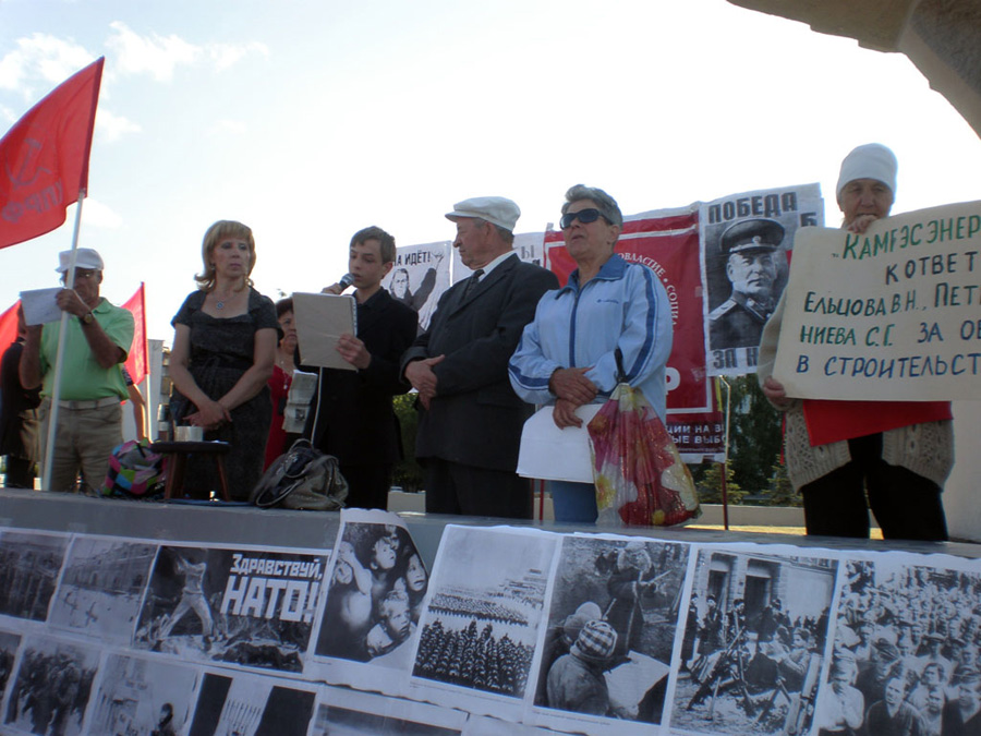 Митинг открыла первый секретарь Набережночелнинского Горкома КПРФ Татьяна Гурьева. Всего на митинге выступило 12 человек. Выступающие вспоминали годы войны, осуждали предательство нынешних властей, призывали трудовой народ объединяться в борьбе за достойную жизнь за социализм. Участников митинга удивило взрослое выступление 16-летнего школьника Андрея Чехлова и разумеется, обрадовало, что есть среди детей достойные продолжатели дела Ленина, дела социализма.