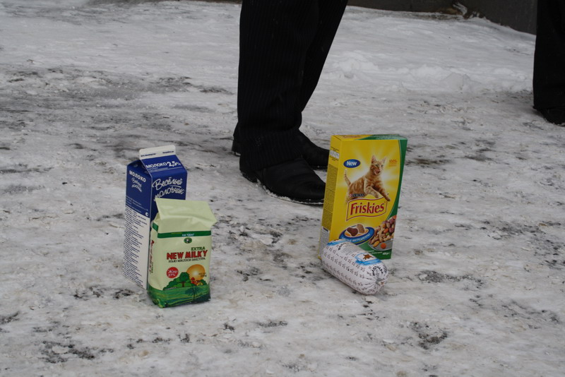 На пикете общественники поставили рядом молоко в упаковке с сухим молоком в пакете и колбасу с кормом для кошек. Представители «Родительского комитета» и Союза медиков рассказывали заинтересованным прохожим, что состав сравниваемых продуктов не сильно отличается и доказывали это результатами исследований Сибирского Федерального Центра оздоровительного питания. За несколько минут перед немногочисленными пикетчиками столпилась толпа, заинтересованная информацией.