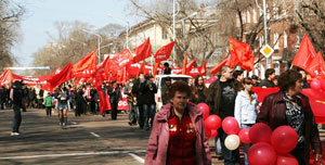 К 10.30 колонна демонстрантов выстроилась на площади Победы. Отсюда и началось движение по главной магистрали областного центра. Яркое солнце и переливы кумача, звуки духового оркестра и боевые речевки, дружеские улыбки и обилие молодых лиц. Участники двигаются под лозунгами: