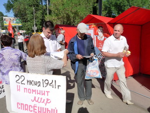 22 июня в центре Заводского района г.Саратова, на пересечении проспекта Энтузиастов и улицы Авиастроителей, в рамках Всероссийской акции протеста против дискриминации и унижения военных ветеранов и пенсионеров состоялся протестный митинг, посвященный 69-й трагической годовщине начала Великой Отечественной войны, против фальсификации истории, преуменьшения заслуг Коммунистической партии и очернительства героического подвига Советского народа в борьбе с западно-европейским фашистским нашествием.