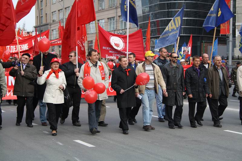 Более 3 тысяч человек под лозунгом «Нет политической монополии!» и звуки духового оркестра прошли стройной колонной от часовни на Красном проспекте по Октябрьской магистрали до ГПНТБ, скандируя: «Нет политической монополии «Единой России». Оппозиционеры выдвинули основные лозунги Первомайской демонстрации: «Пенсионерам — льготный проезд!», «Коррумпированным чиновникам — уголовный кодекс!», «Остановим рост цен и тарифов!» и «Первомай — день борьбы за права трудящихся!».