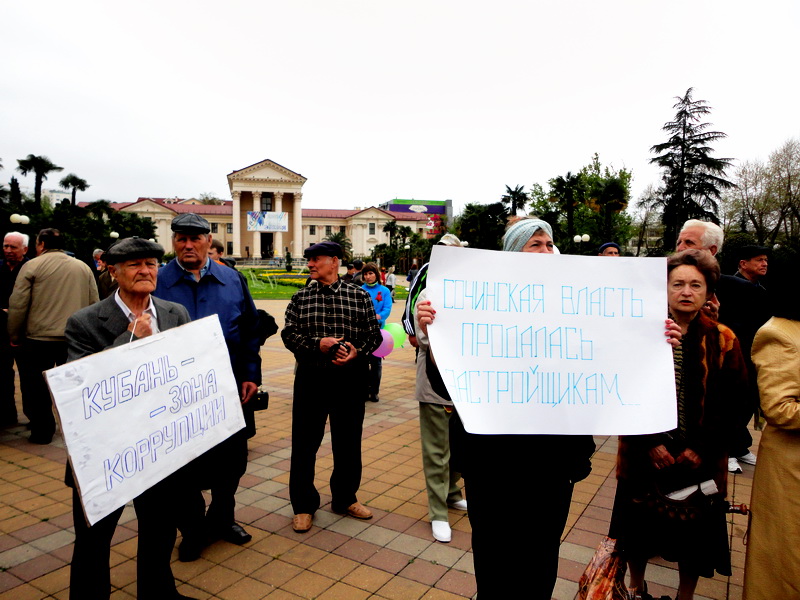 Кого они собираются побеждать, не ясно, -говорит участница митинга коммунистов, врач Лина Иванова. Она вышла с плакатом: «Сочинская власть продалась застройщикам!» Лина Леонидовна рассказала, как на улице Нагорной, где она проживает судебная и исполнительная власть в лице Главы города Анатолия Пахомова и председателя Центрального районного суда Анатолия Лаврика содействуют незаконной застройке центра города 20 –этажным небоскребом, который строят нелегалы.