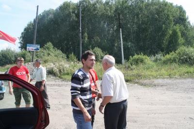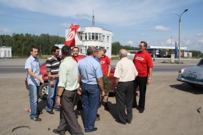Колонну автопробега «20 лет без СССР» на въезде в Болотное Новосибирской области встретили депутаты фракций КПРФ районного и городского Советов. Руководитель пробега Сергей Сухоруков сверил планы и график мероприятий с секретарём Болотнинской районной организации КПРФ Владимиром Дергачом.